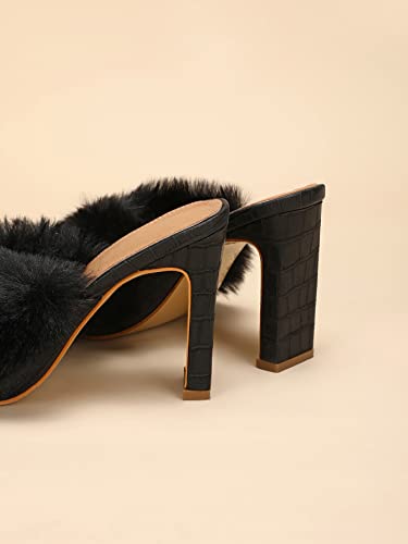 azmodo Women's Faux Fur Slip on Square Toe Chunky Heels Slides High Heels Sandals Mules Party Shoes (Black, 8)
